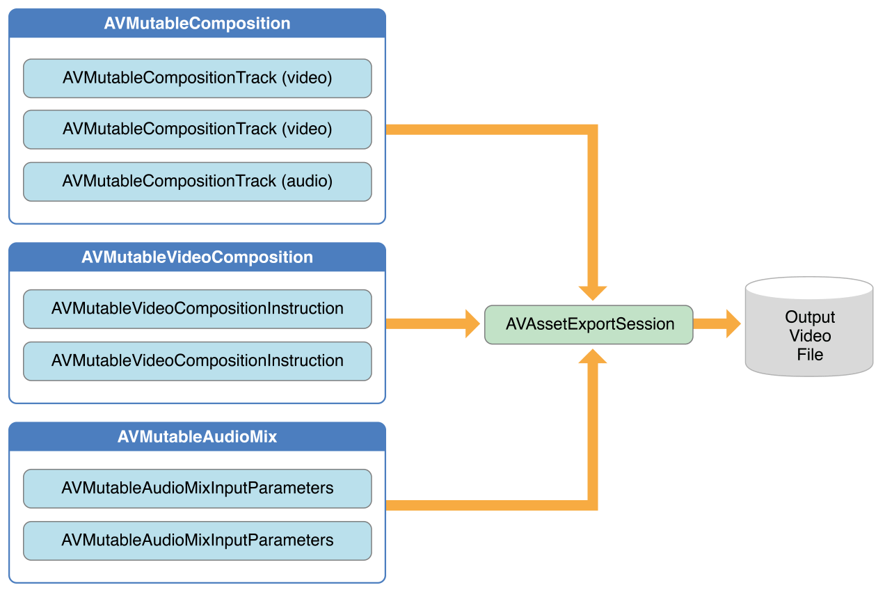 The AVFoundation framework provides a feature-rich set of classes to facilitate the editing of audio visual assets. At the heart of AVFoundation’s editing API are compositions. A composition is simply a collection of tracks from one or more different media assets. The AVMutableComposition class provides an interface for inserting and removing tracks, as well as managing their temporal orderings. Figure 3-1 shows how a new composition is pieced together from a combination of existing assets to form a new asset. If all you want to do is merge multiple assets together sequentially into a single file, that is as much detail as you need. If you want to perform any custom audio or video processing on the tracks in your composition, you need to incorporate an audio mix or a video composition, respectively.