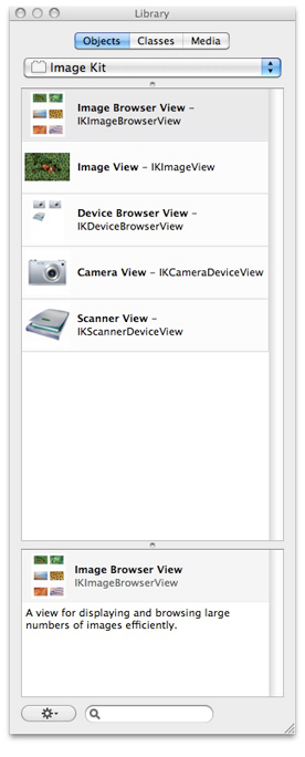 In Interface Builder's Library window, use the pop-up Library menu to choose the ImageKit library. This displays a list of ImageKit objects, as shown in Figure 2-2
