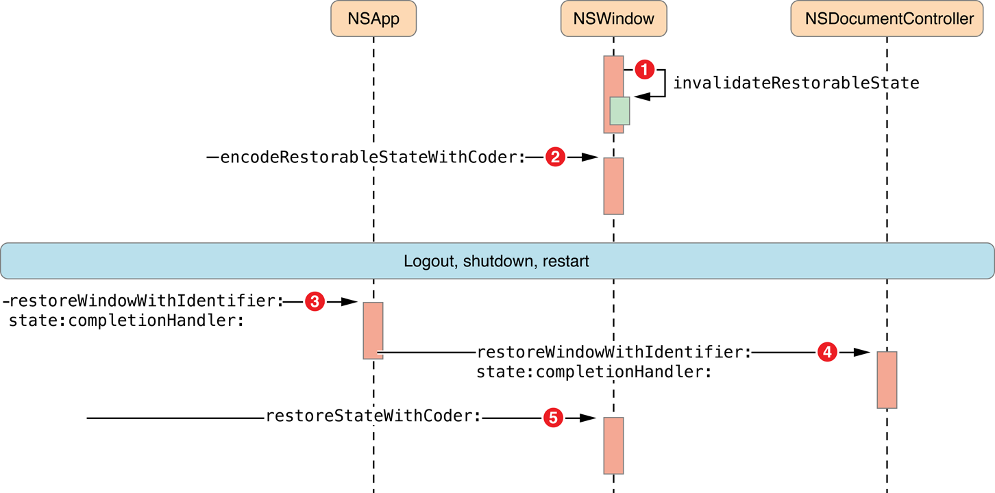 3. When the system restarts, Cocoa relaunches the app and sends the restoreWindowWithIdentifier:state:completionHandler: message to the NSApp object.