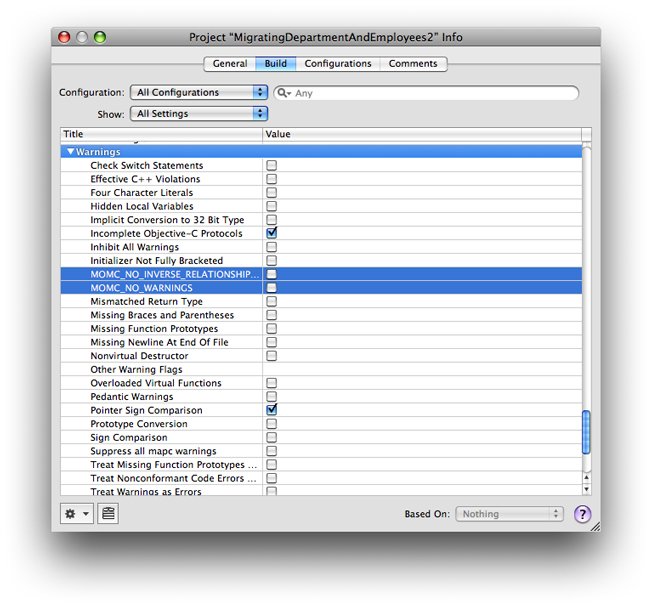 The compiler can generate warnings for various model configuration problems (such as unidirectional relationships). You can toggle these warnings by checking the appropriate boxes in the Warnings section of the project Build panel, as shown in Figure 1.