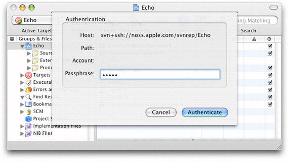 If you use SSH to access a Subversion repository, Xcode may ask you to enter your passphrase in the Authentication dialog, shown in Figure 21-3.