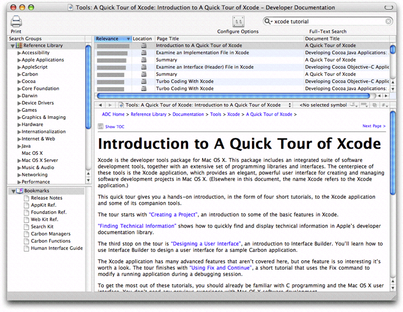 As you are working on your software product, you often need to find information on system technologies. Xcode also includes a full-featured documentation viewer and installs a comprehensive suite of technical documentation. Using Xcode’s documentation lookup features, you can quickly and easily search all or part of Apple’s technical documentation for questions, keywords, or symbols.