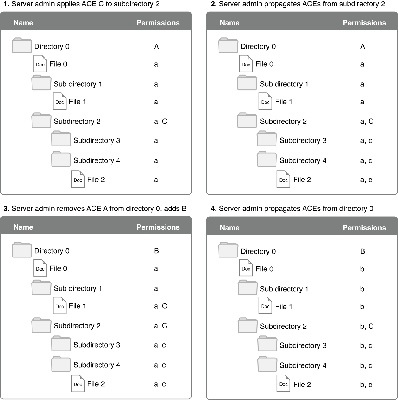 An ACL consists of an ordered list of ACEs (access control entries), each of which associates a user or group with a set of permissions and specifies whether each permission is allowed or denied. ACEs also include attributes related to inheritance (see Inheritance of Permissions).