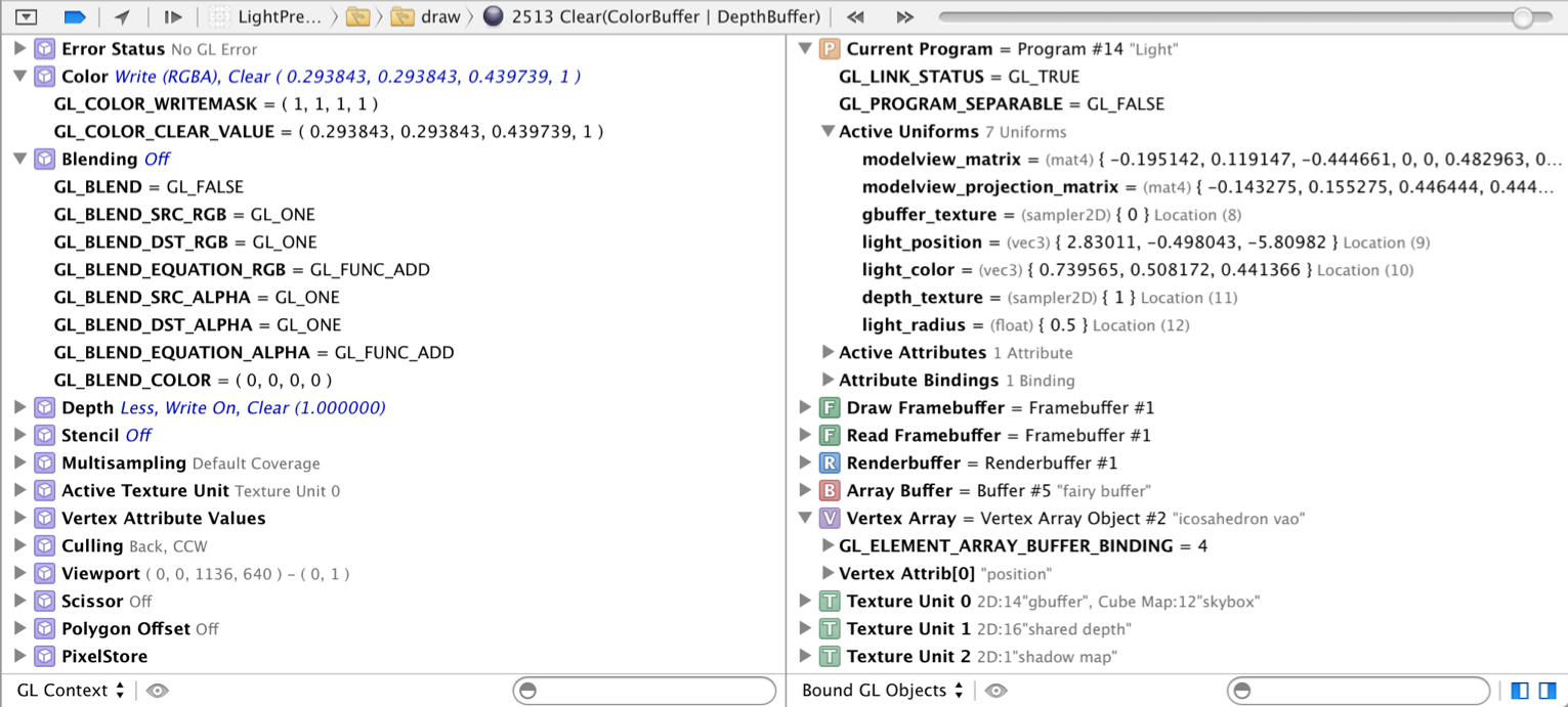 If the selected call binds a resource or makes use of bound resources such as vertex array objects, programs, or textures, the view automatically lists relevant items from the Bound GL Objects view.