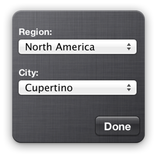 Apple provides a subclass of the AppleButton, called the AppleGlassButton, to make it easy to use the standard glass-style buttons found commonly on widget backs. For example, the Done button on the back of a widget is usually a glass button, as shown in Figure 28.