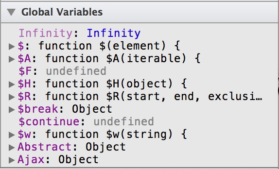 Variables attached to the global object window appear under the Global Variables section, as shown in Figure 4-10. This includes global variables you define in your scripts, global variables defined in installed extensions, and methods and properties of window.
