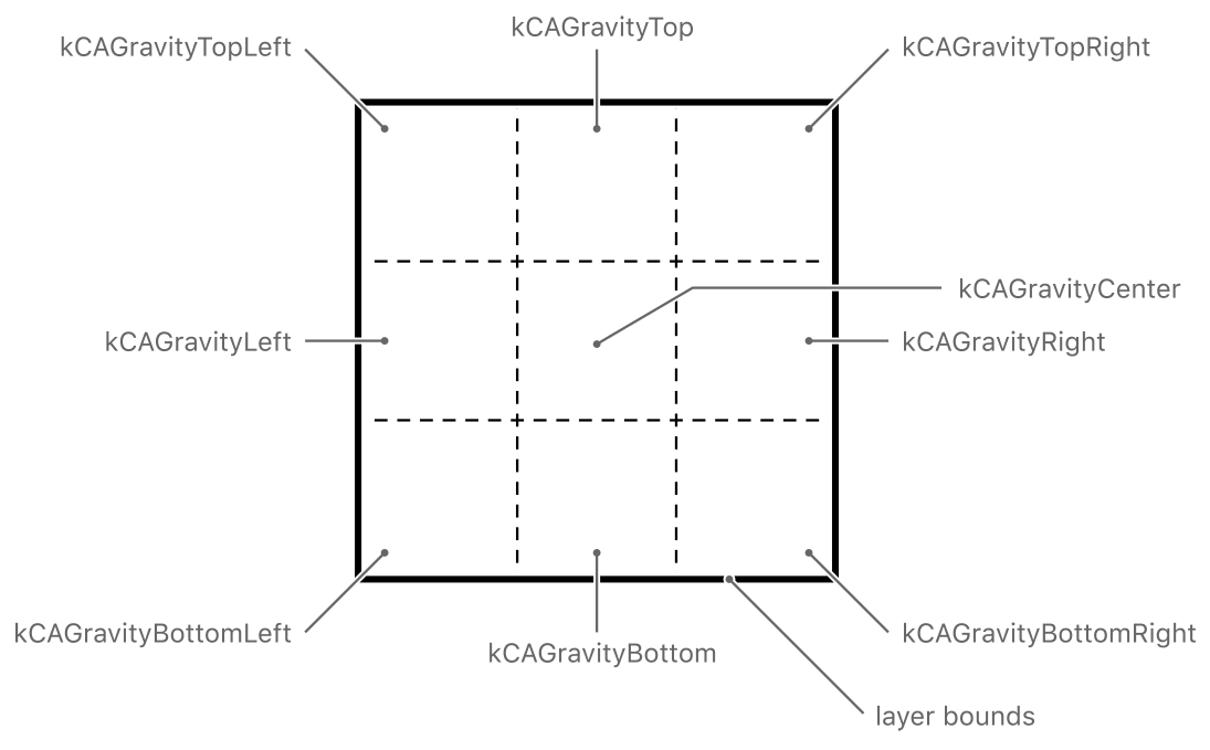 • The position-based gravity constants allow you to pin your image to a particular edge or corner of the layer’s bounds rectangle without scaling the image.