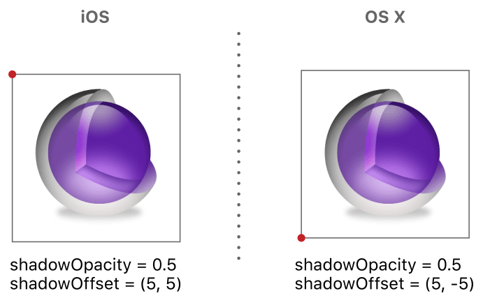 The CALayer class includes several properties for configuring a shadow effect. A shadow adds depth to the layer by making it appear as if it is floating above its underlying content. This is another type of visual adornment that you might find useful in specific situations for your app. With layers, you can control the shadow’s color, placement relative to the layer’s content, opacity, and shape.