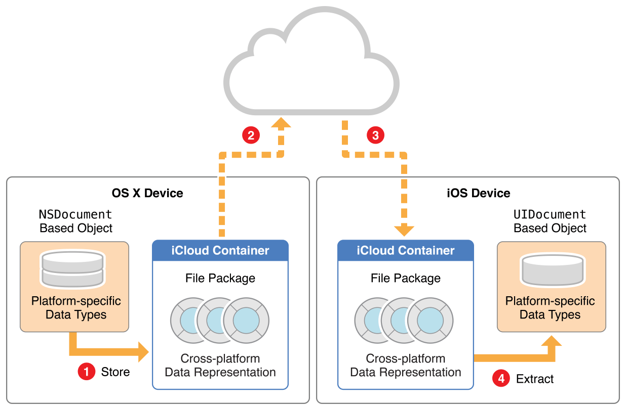 Adopting iCloud document storage makes your app’s documents available on all of a user’s devices. A document (based on the UIDocument class in iOS or the NSDocument class in OS X) is an assemblage of related data that can be written to disk as a single file or as a file package. A file package, in turn, is a directory presented to the user as a single file and made accessible to your app through an NSFileWrapper object.