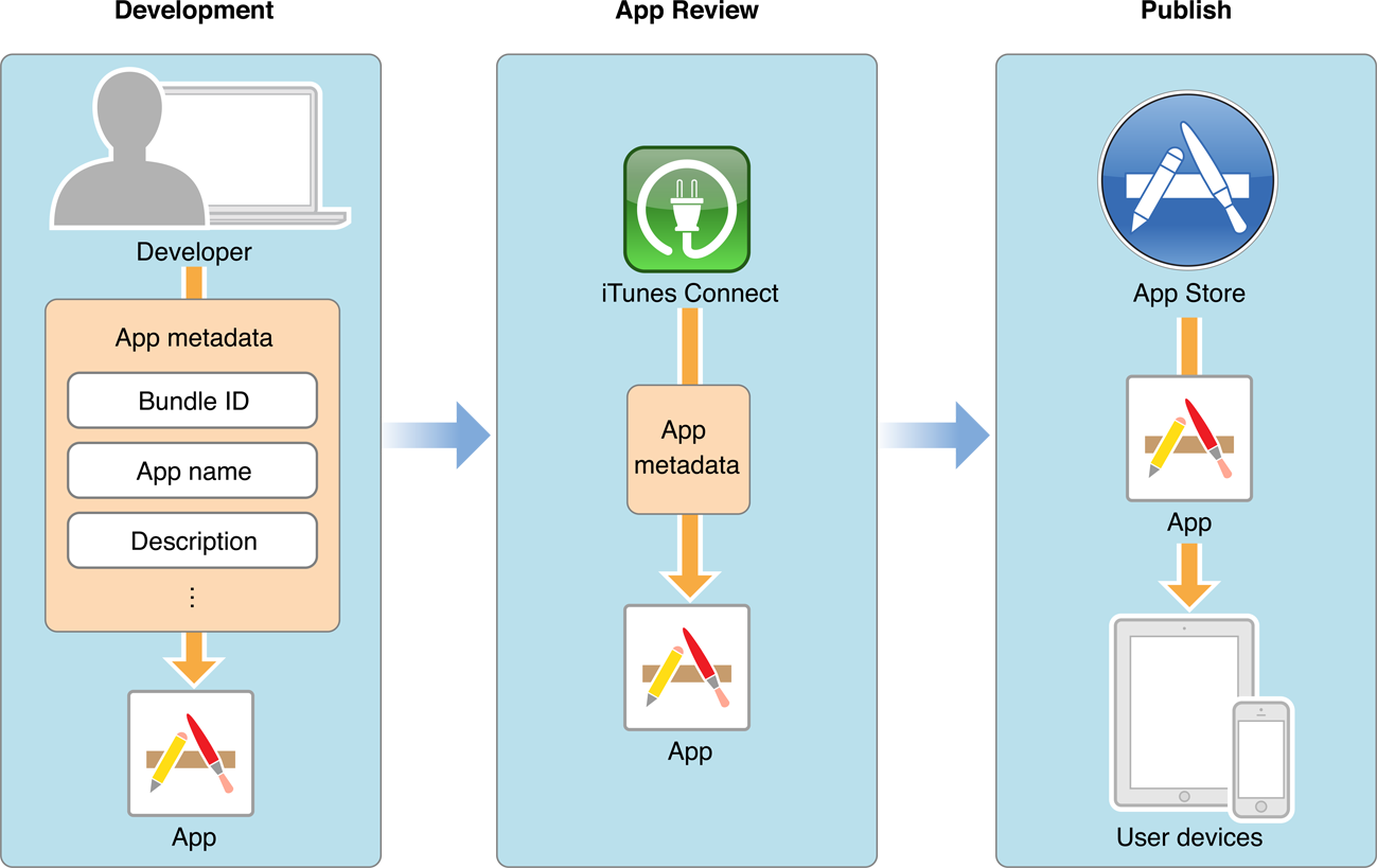 Figure 1-4 shows the additional steps required and the process when creating Game Center assets. Although this step is not shown, your app bundle and metadata are submitted to iTunes Connect as before.