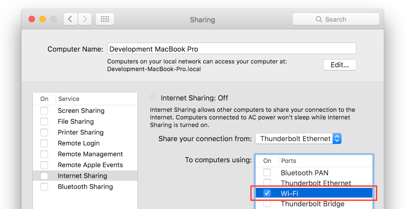 Choose the network interface that provides your Internet connection, such as Thunderbolt Ethernet.