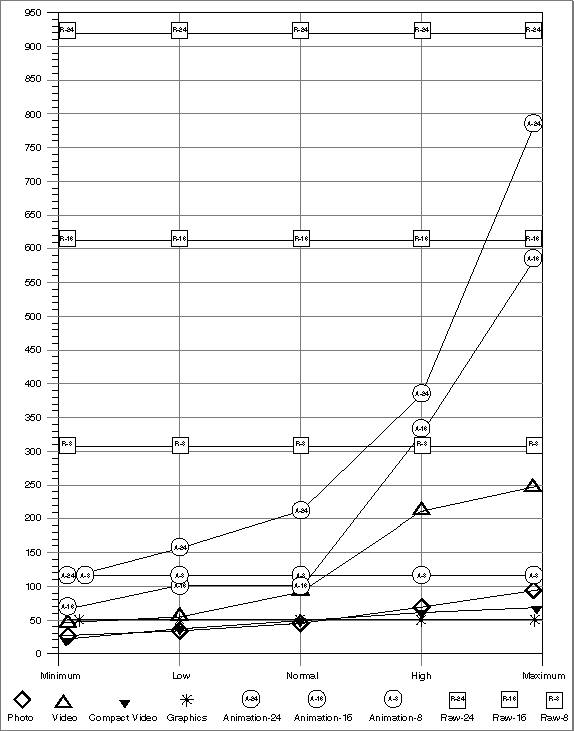 All of the graphs show the compressed data size (in kilobytes) versus the quality of an image at minimum, low, normal, high, and maximum compression settings. The Raw Compressor is included to show the size of the image in raw pixels. The Raw Compressor is not useful for storing still images, since it does not even use the simple packing technique used by QuickDraw (notice that the 24-bit raw format is larger than the uncompressed PICT file).
