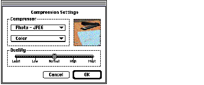 Standard image compression dialog components support two basic dialog boxes. One dialog box provides a minimal interface and is suitable for compressing single images. Figure 13-1 shows an example of this dialog box. Using this dialog box, the user can select a compressor component, the pixel depth for the operation, and the desired spatial quality.