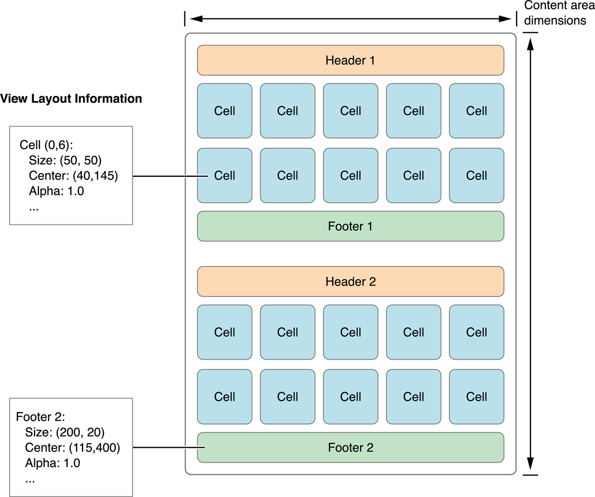 Figure 1-2 shows how a vertically scrolling flow layout arranges its cells and supplementary views. In a vertically scrolling flow layout, the width of the content area remains fixed and the height grows to accommodate the content. To compute the area, the layout object places views and cells one at a time, choosing the most appropriate location for each. In the case of the flow layout, the size of the cells and supplementary views are specified as properties, either on the layout object or by using a delegate. Computing the layout is just a matter of using those properties to place each view.