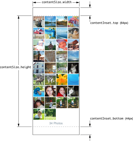 The contentInset property is a UIEdgeInsets struct with the fields top, bottom, left, right. Figure 1-3 shows the content with the contentInset and contentSize indicated.