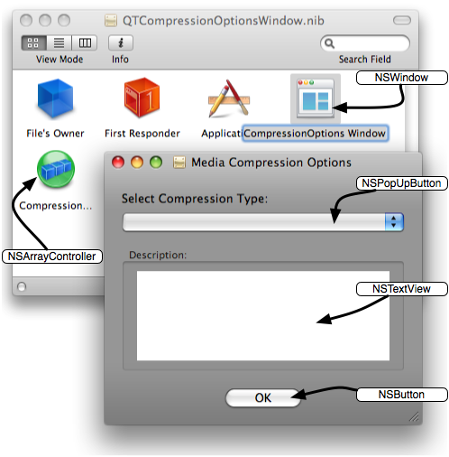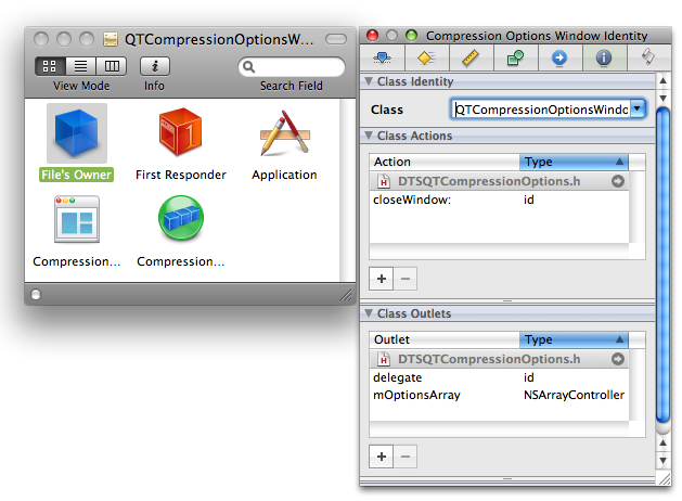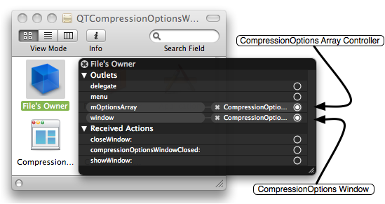 The File’s Owner acts as a placeholder for the object that will manage the contents of the nib file after it is loaded. Our nib file contains two objects that must be referred to by instances of QTCompressionOptionsWindow; the NSWindow named "CompressionOptions Window" and the NSArrayController named "CompressionOptions Array Controller".