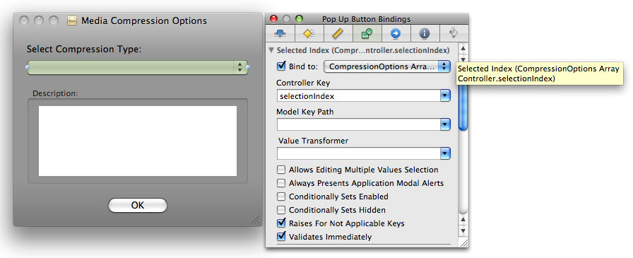 Establishing this binding in Interface Builder is equivalent to programatically sending the localizedCompressionOptionsSummary message to the currently selected QTCompressionOptions instance and displaying the returned string in the text view. We know what the index is for the currently selected item because of the above Selected Index binding.