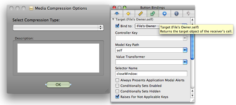 Establishing this binding in Interface Builder is equivalent to programatically sending the closeWindow: message to an instance of QTCompressionOptionsWindow when the 'OK' button is clicked.
