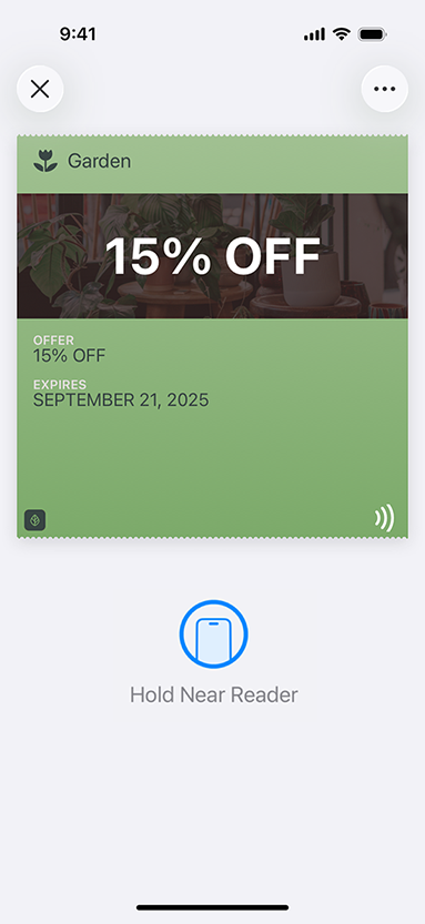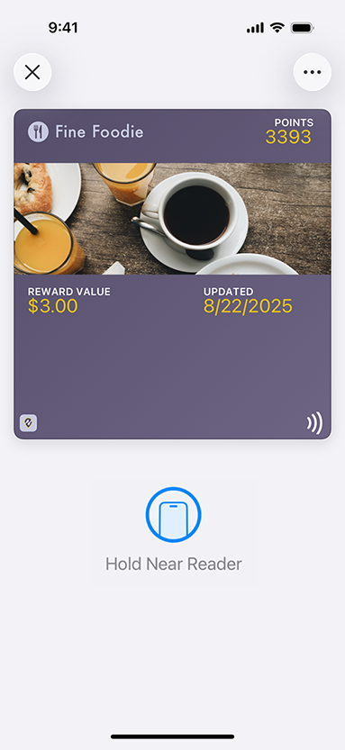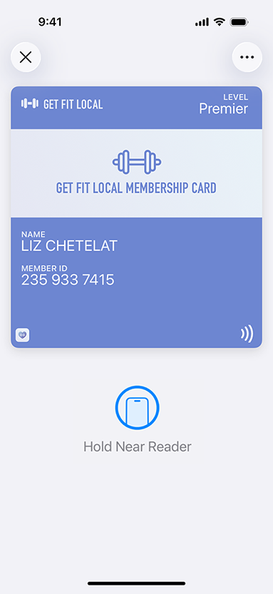 Passes can work with NFC readers for contactless redemption. Users hold their device near a reader with contactless symbol to use a pass, with no need for a barcode. If you’re developing an NFC-enabled pass to use with Apple Pay, learn about supporting loyalty and membership passes on Apple platforms.