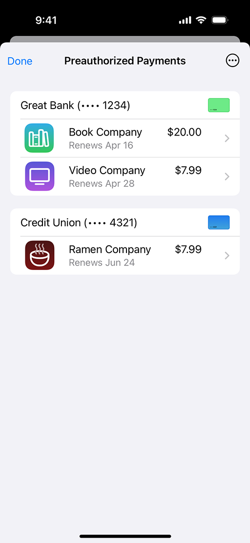 The all-new Preauthorized Payments section in Wallet provides a clearer view of recurring charges authorized through Apple Pay.1 Now people can better track subscriptions, auto-reloads, installment loan repayments, recurring billing, and deferred payments to maintain better insight into their ongoing financial commitments. Preauthorized Payments also allow people to better manage their recurring charges with merchants or issuers, enabling to them revoke payment authorization in Wallet if needed.