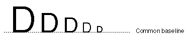 The baselineof a glyph is a line that defines the position of the glyph with respect to other glyphs. The importance of the baseline is illustrated when different size glyphs are used; in this case the baseline represents a stable place from which glyphs rise and descend proportionally. The following figure shows the common baseline for Roman glyphs: