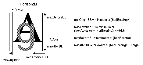 An example of the minOriginSB, minAdvanceSB, maxBeforeBL, and minAfterBL values for horizontal text is given in the following figure. These values are calculated from the min and max values of the glyph metrics, which come from the bitmap data table.