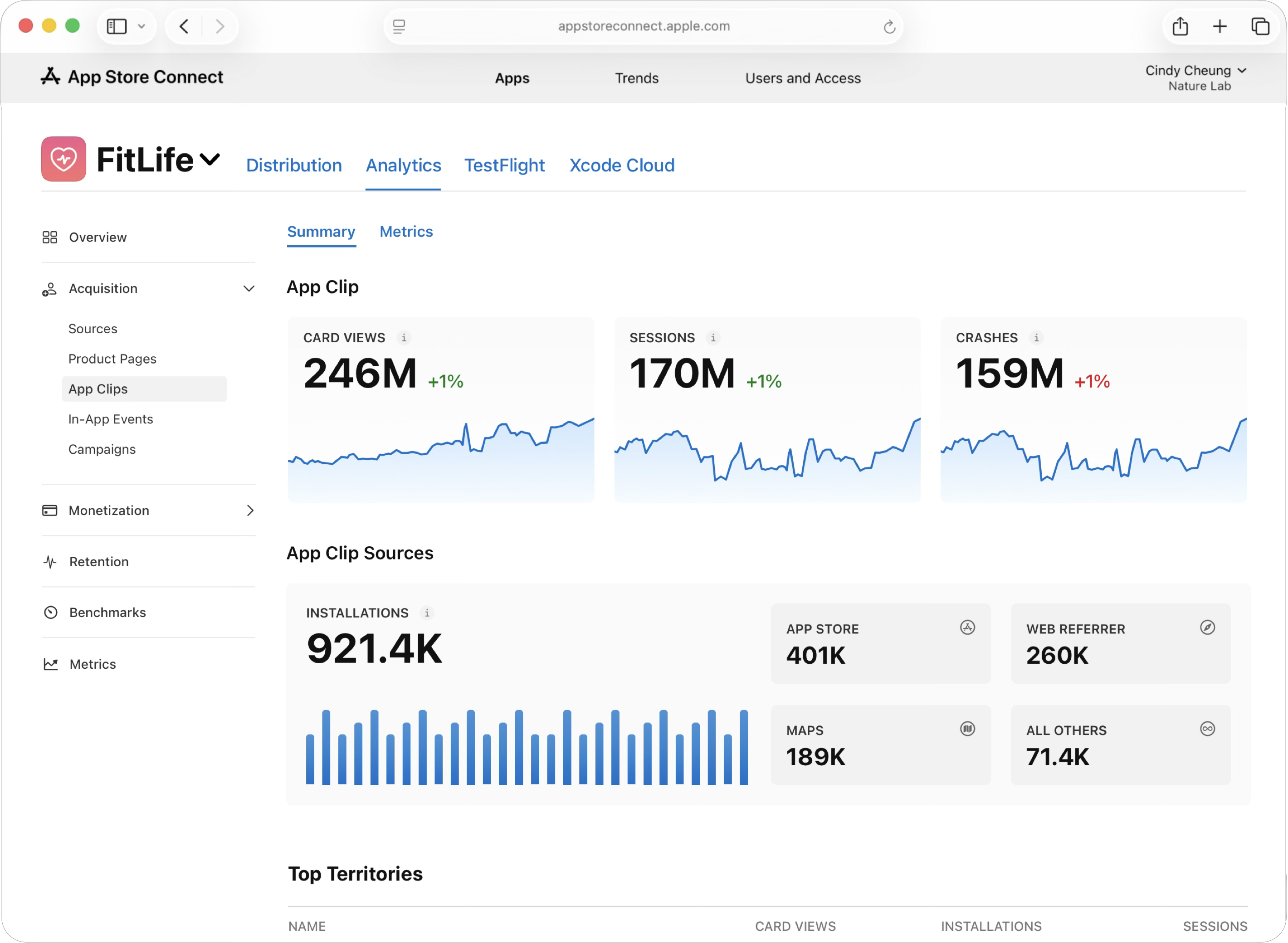 App Clips provide quick access to a specific app feature without requiring a full download, offering a lightweight experience at the moment it is most useful. App Store Connect Analytics helps you measure App Clip discovery, usage, and engagement through metrics like card views, installations, sessions, active devices, and crashes. This data covers performance across invocation sources such as NFC tags, App Clip Codes, Safari, and Maps. You can segment results by source, device, and territory to measure success in driving new users, engagement, and full app downloads.