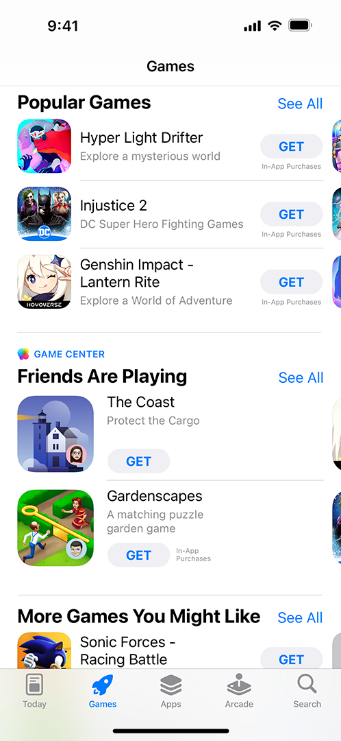 App Store. 플레이어는 App Store에서 Game Center 및 ‘친구들이 플레이 중인 게임’ 섹션을 통해 친구들이 하고 있는 새로운 게임을 발견할 수 있습니다.