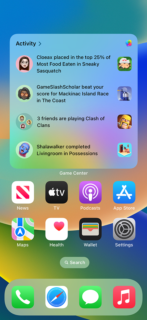 위젯. 플레이어는 홈 화면에 Game Center 활동 및 ‘계속 플레이하기’ 위젯을 추가하여 친구들이 플레이 중인 Game Center 지원 게임을 발견하고 빠르게 게임에 참여할 수 있습니다.