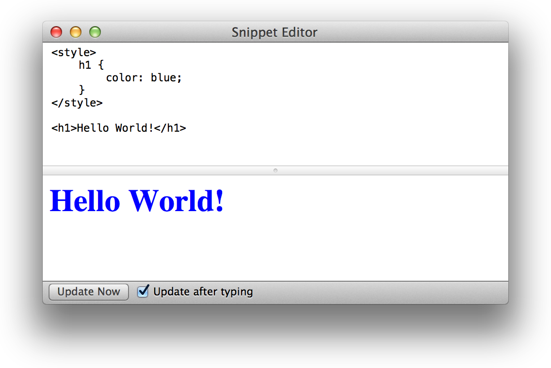 Snippet Editor provides an interactive sandbox for previewing HTML and CSS, as shown in Figure A-2.