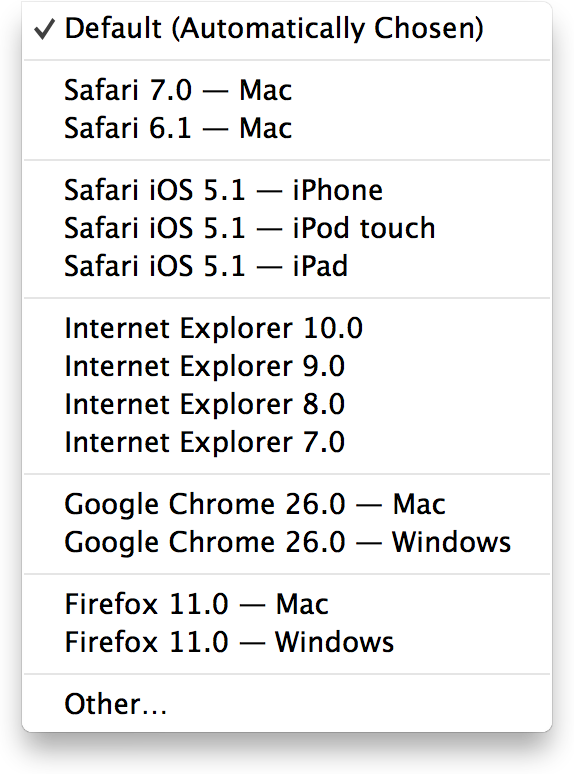 You can choose the common versions of most popular browsers from the submenu. Note that the list includes the versions of Safari found on iPhone, iPad, and iPod touch.