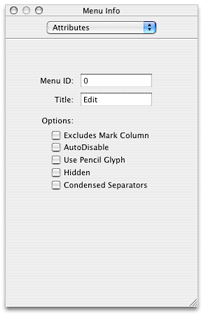 If you select a menu and then select the Show Info menu item in Interface Builder’s Tools menu, you bring up the Info Palette for that menu, as shown in Figure 2-3.