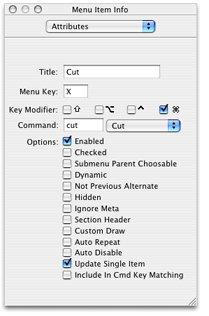• For each item, you assign a name by double-clicking the item or by changing the title from the Info panel. If desired you can also assign a keyboard equivalent and check any desired attributes. You should also assign a command ID to each item, which will be used in event handling. See Simple Event Handling for more details.