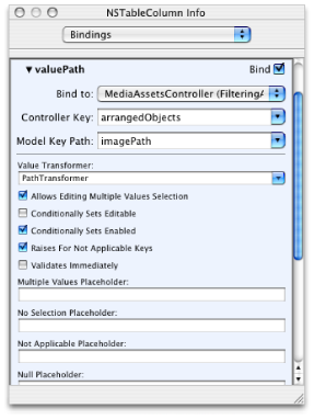 Next, you bind the image views to the controllers. A subset of the value bindings of an NSImageView and an NSTableColumn (containing an NSImageCell) to choose from are: