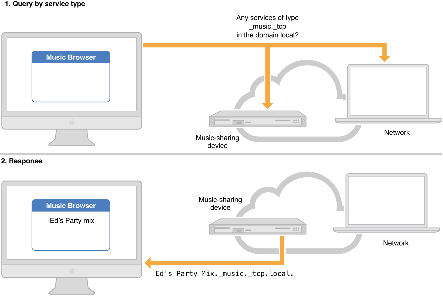 Figure 4-2 illustrates a client application browsing for music sharing services. In step 1, the client application issues a query for services of type _music._tcp in the local. domain to the standard multicast address 224.0.0.251. Every Multicast DNS responder on the network hears the request, but only the music sharing device responds with a PTR record (step 2). The resulting PTR record holds the service instance name, Ed's Party Mix._music._tcp.local. in this case. The client app can then extract the service instance name from the PTR record and add it to an onscreen list of music servers.