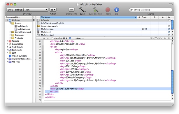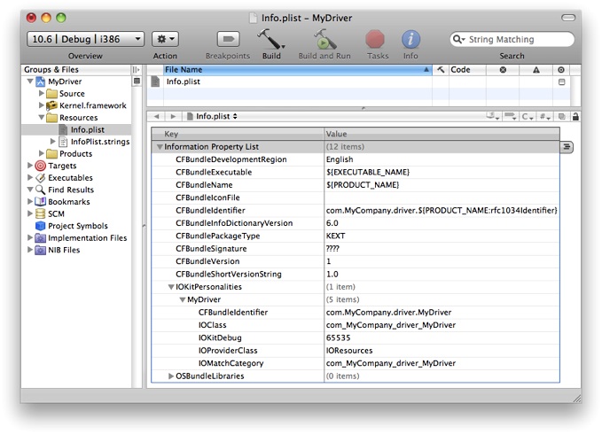 Info.plistfile in the editor pane. You should see the elements of the property list file, as shown in Figure 1.Figure 1 MyDriver Info.plist