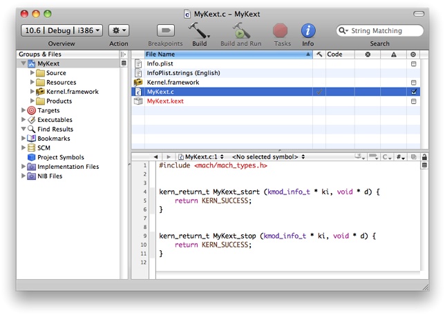 The new project contains several files, including a source file, MyKext.c, that contains templates for the kext’s start and stop functions.