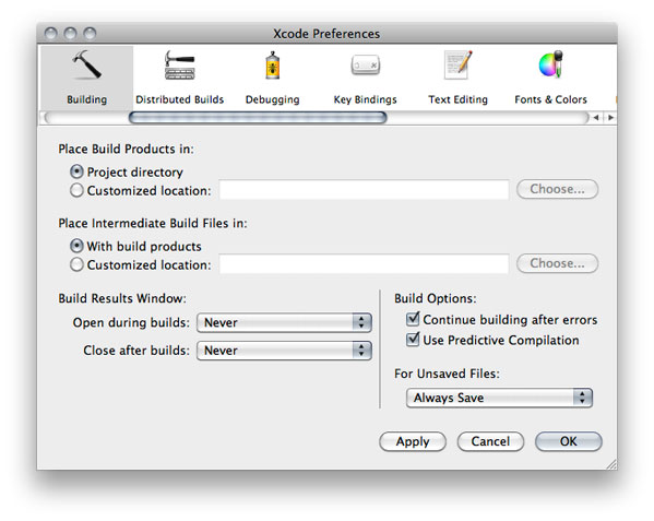 The Building pane of Xcode preferences allows you to set default project build locations and the behavior of the Build Results window and the Errors and Warnings smart group. Figure 8-10 shows the Building preferences pane.
