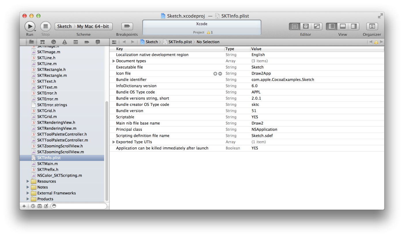 An information property list (Info.plist) file contains essential runtime-configuration information for the app. Xcode provides a version of this file with every Mac application project and configures it with several standard keys. Although the default keys cover several important aspects of the app’s configuration, most apps require additional keys to specify their configuration fully.