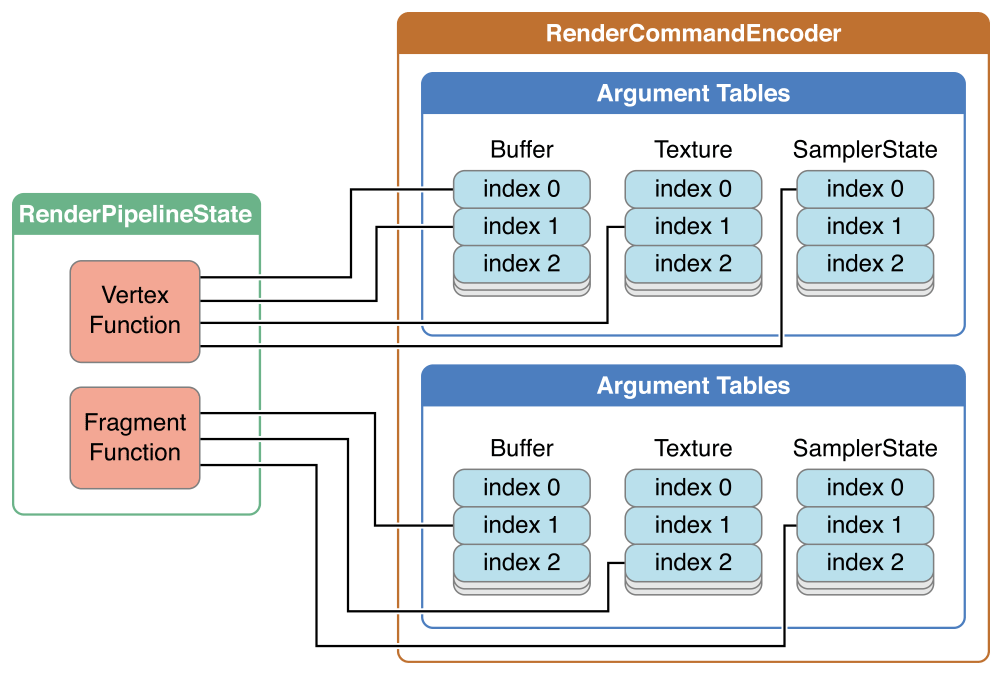 currentTextureis assumed to contain aMTLTexturethat is used for a color attachment.) Then theMTLRenderPassDescriptoris used to create a newMTLRenderCommandEncoder.Create two