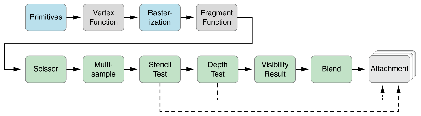 This chapter describes how to create and work with MTLRenderCommandEncoder and MTLParallelRenderCommandEncoder objects, which are used to encode graphics rendering commands into a command buffer. MTLRenderCommandEncoder commands describe a graphics rendering pipeline, as seen in Figure 5-1.