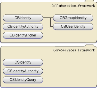 There are two levels to the Identity Services APIs: the C-based Core Services Identity API and the Objective-C-based Collaboration framework. The Core Services Identity API is comprised of three Core Foundation-based objects that allow you to create, manipulate, and remove users and groups: an identity object, an identity query object, and an identity authority object. The Collaboration framework is a set of wrapper classes for the Core Services Identity API objects. Additionally, it provides user interface support for applications.