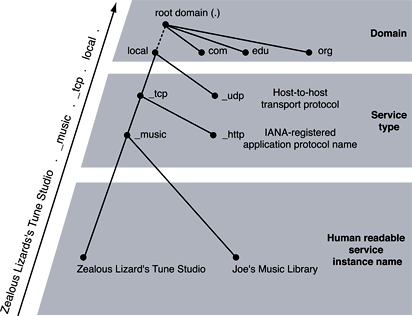 The final element of Bonjour is service discovery. Service discovery allows applications to find all available instances of a particular type of service and to maintain a list of named services. The application can then resolve a named instance of a service to an IP address and port number, as described in Naming.