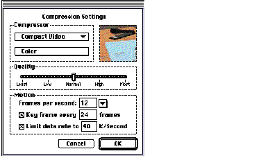 By using standard dialog components, you can avoid many of the details of obtaining, validating, and using image compression parameters. The process of validating image compression parameters can be very involved, depending upon the capabilities of the selected compressor component. Apple’s standard image compression dialog component verifies that the user’s settings are valid for the selected compressor. In addition, this component uses a test image to demonstrate the effects of the user’s compression settings.