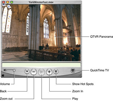 QuickTime VR also has redesigned controls (Figure 1-7), available on both Mac OS 9 and Mac OS X. One significant change is the “show hotspots” button, which now toggles between showing and hiding hotspots when clicked (previously, it showed hotspots only while being clicked). A new cubic playback engine is also provided in QuickTime 5, discussed in the section New QuickTime VR Cubic Engine. This feature enables the viewer to see all the way up and all the way down –– in effect, all six faces of a cube –– by clicking in a VR panorama.