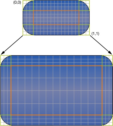 You specify the stretchable area of a view using the contentStretch property. This property accepts a rectangle whose values are normalized to the range 0.0 to 1.0. When stretching the view, the system multiplies these normalized values by the view’s current bounds and scale factor to determine which pixel or pixels need to be stretched. The use of normalized values alleviates the need for you to update the contentStretch property every time the bounds of your view change.