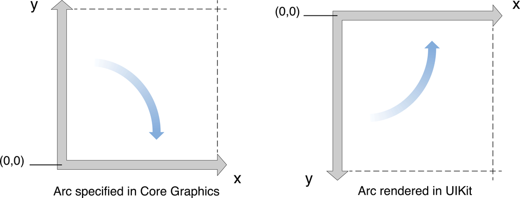 If you draw a path with functions such as CGContextAddArc and CGPathAddArc and assume a LLO coordinate system, then you need to flip the CTM to render the arc correctly in a UIKit view. However, if you use the same function to create an arc with points located in a ULO coordinate system and then render the path in a UIKit view, you’ll notice that the arc is an altered version of its original. The terminating endpoint of the arc now points in the opposite direction of what that endpoint would do were the arc created using the UIBezierPath class. For example, a downward-pointing arrow now points upward (as shown in Figure 1-5), and the direction in which the arc “bends” is also different. You must change the direction of Core Graphics-drawn arcs to account for the ULO-based coordinate system; this direction is controlled by the startAngle and endAngle parameters of those functions.