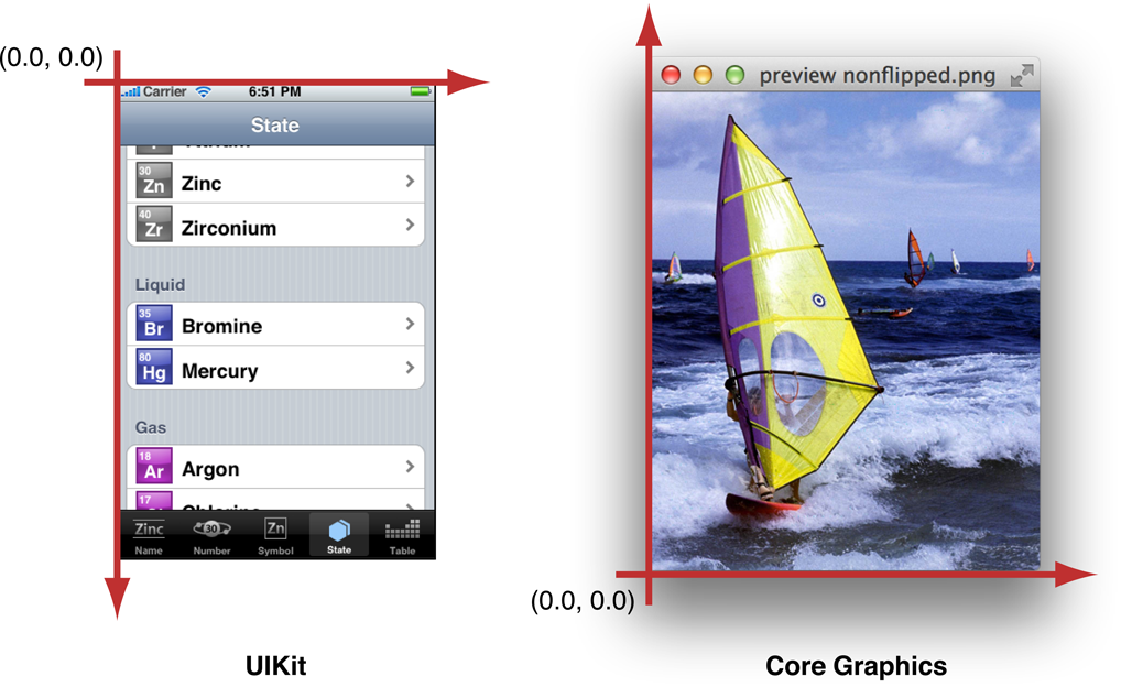 If you want to use Core Graphics functions to draw in a UIKit view, you should use the ULO coordinate system of UIKit for drawing operations. Alternatively, you can apply a flip transform to the CTM and then draw an object in the UIKit view using Core Graphics native LLO coordinate system. Flipping the Default Coordinate System discusses flip transforms in detail.