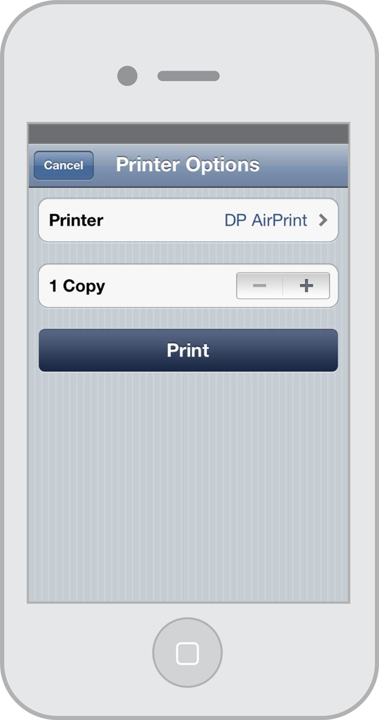 On iPhone and iPod touch devices, UIKit displays a sheet of printing options that an app can animate to slide up from the bottom of the screen, as shown in Figure 5-3.