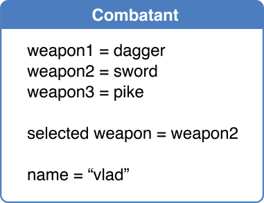 Consider a game application in which the user manages a number of combatants, from which they can select one as an attacker. A combatant can carry three weapons, one of which is selected at any time. In the application, the list of combatants is shown in a table view, the window’s title shows the attacker’s name, and a pop-up menu shows the currently selected weapon, as shown in Figure 11.